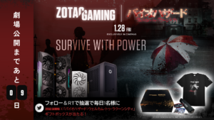 式会社ゾタック日本は、2022年1月28日に公開される映画「バイオハザード: ウェルカム・トゥ・ラクーンシティ」の日本での公開を記念し、2022年1月14日〜2022年2月上旬にかけて豪華オリジナルグッズが当たるキャンペーンをTwitter(@ZOTAC_JAPAN)にて開催中です。キャンペーンの応募はどなたでもTwitterのフォローとリツイートで行なえますのでぜひご参加ください。