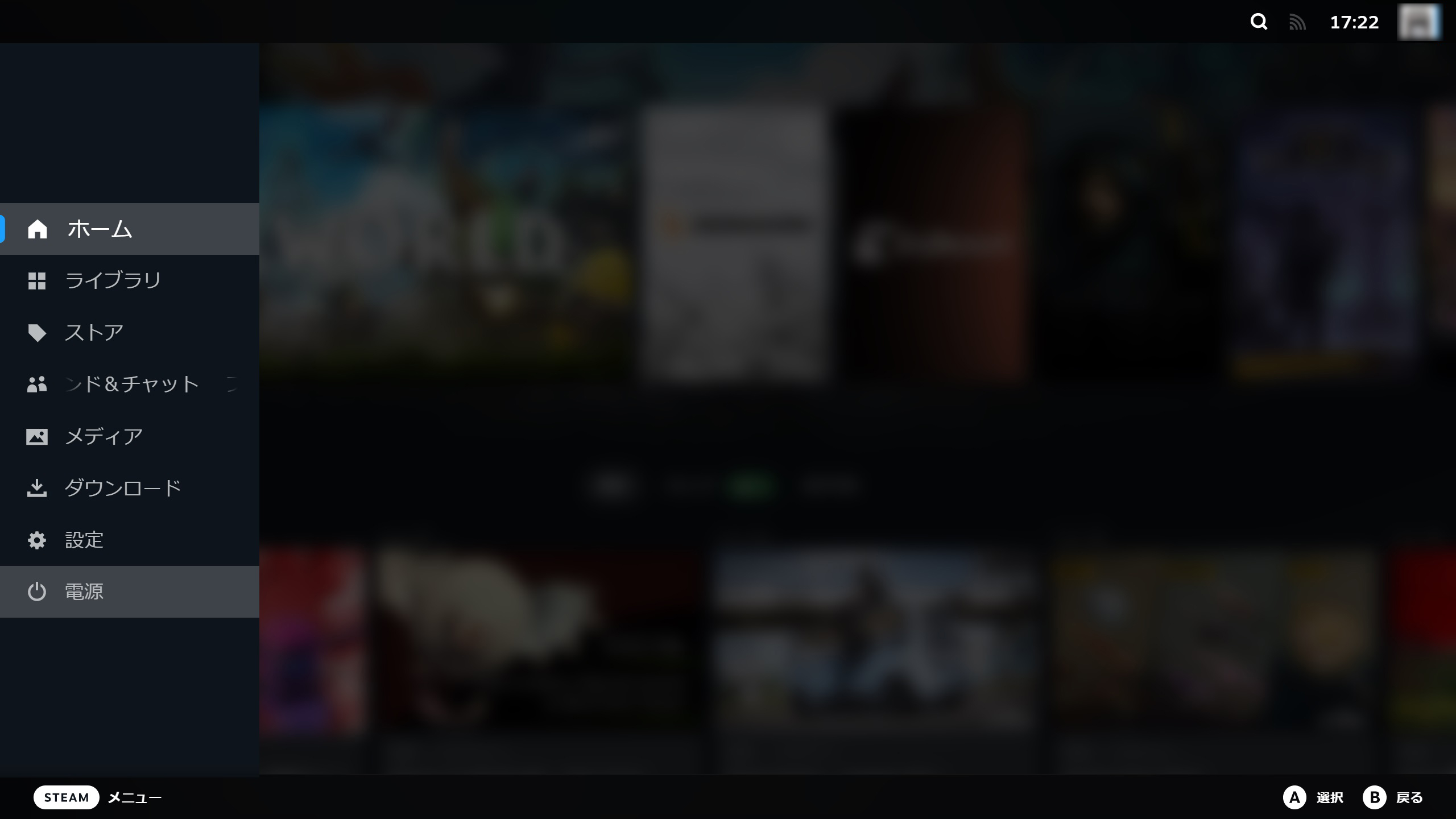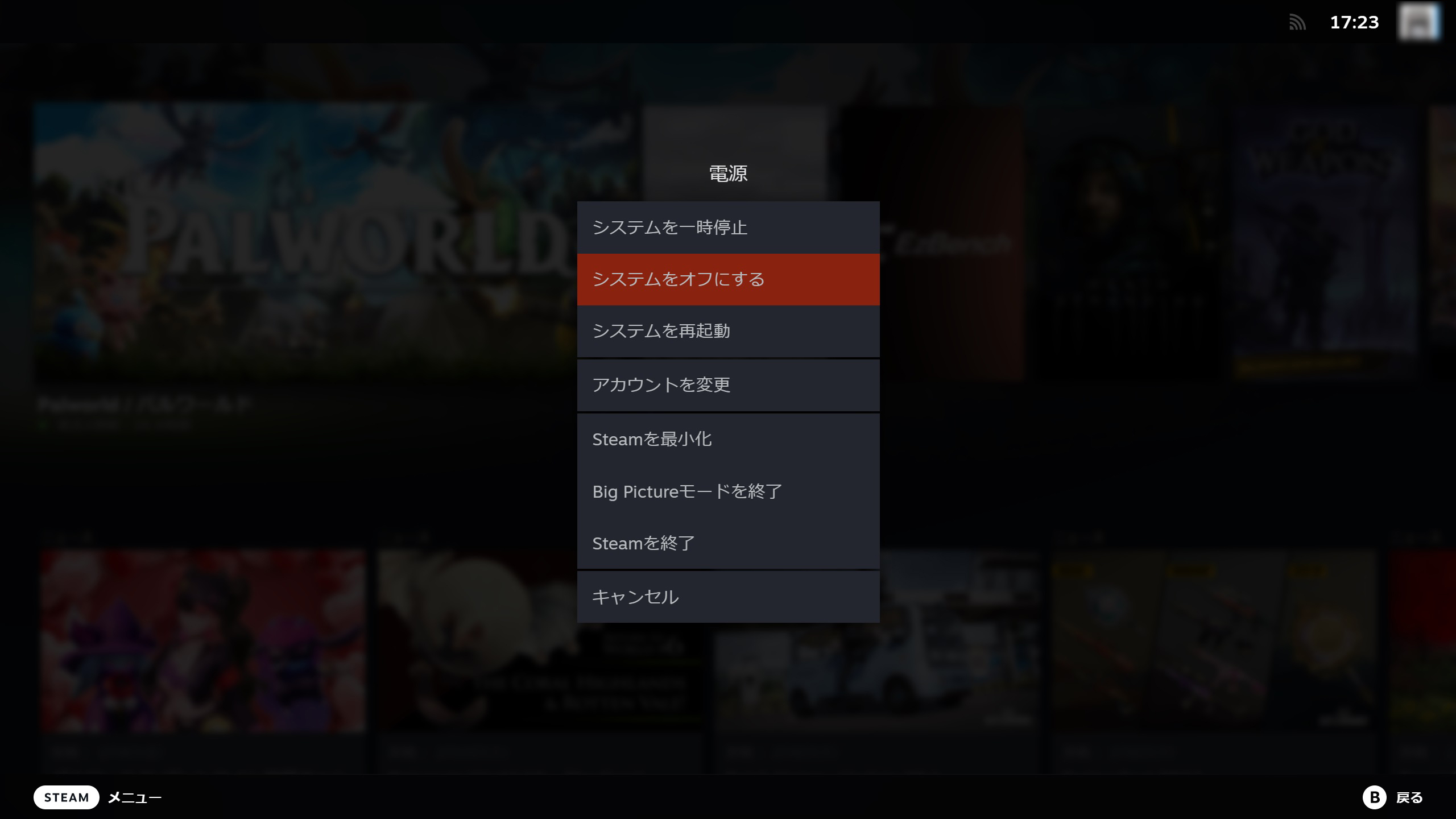 1)Big Pictureモードにおいて「STEAMメニュー」を選択し、「電源」をクリック