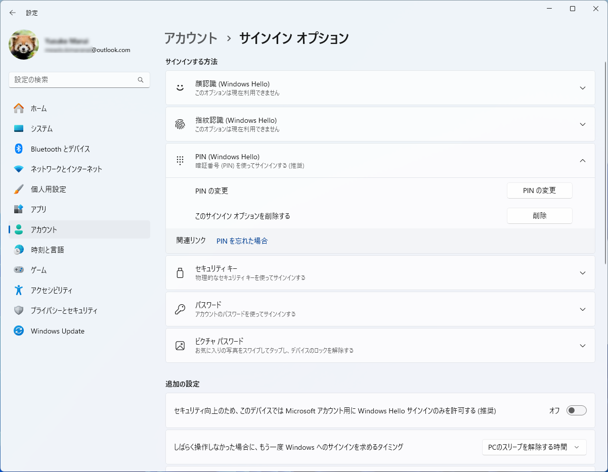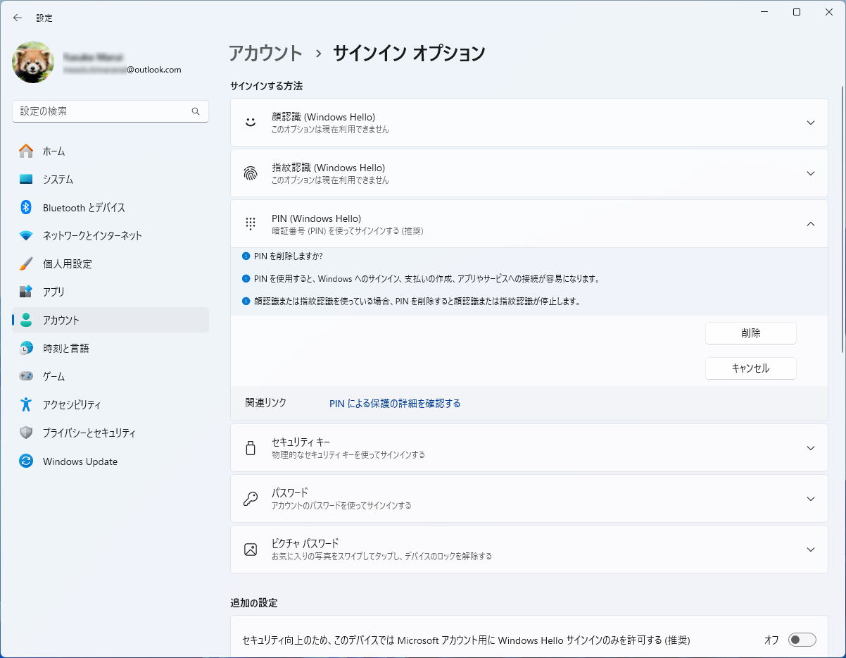 9)PIN(Windows Hello)をクリックし、「このサインイン オプションを削除する」より「削除」をクリック