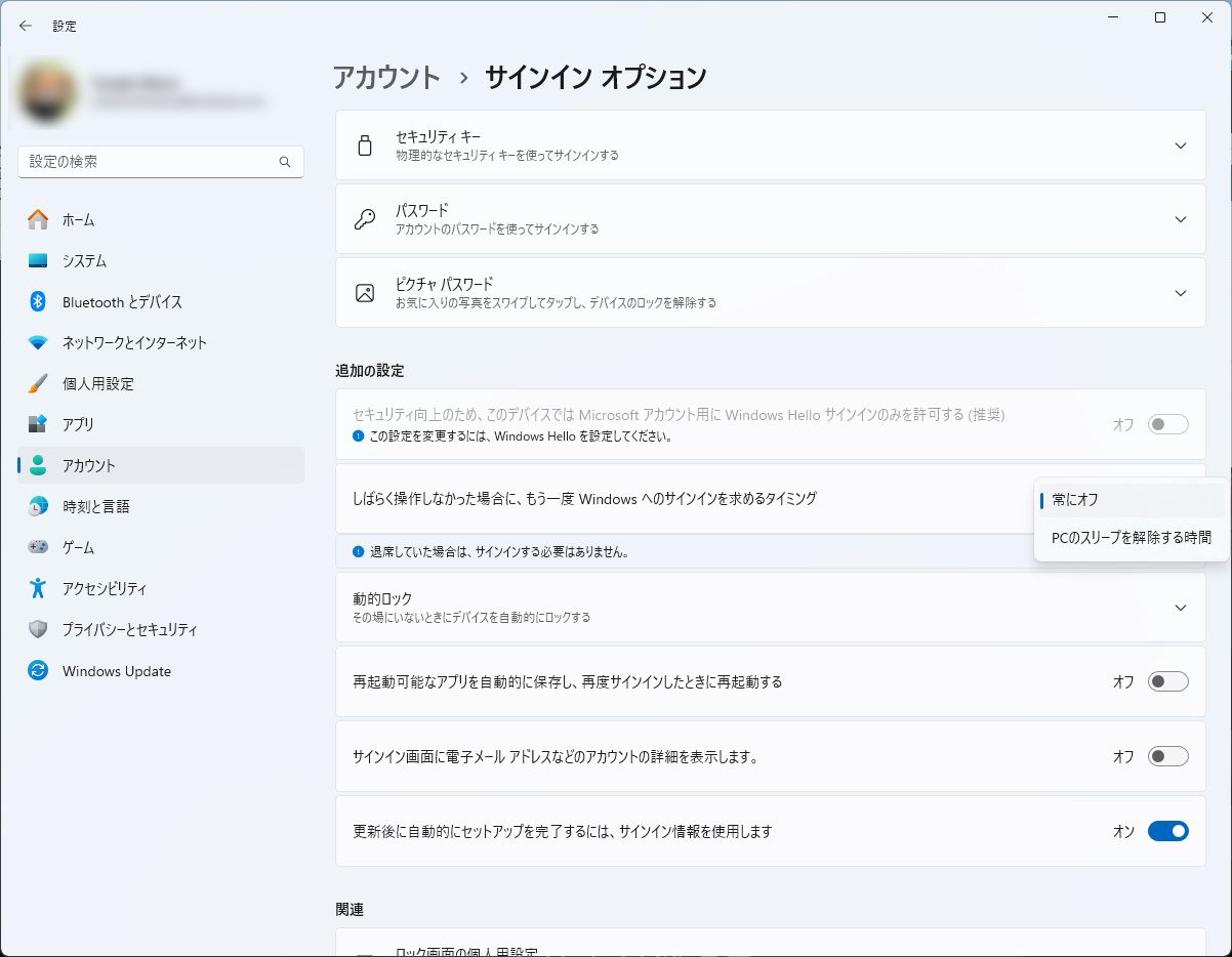 4) 「追加の設定」内の「しばらく操作しなかった場合に、もう一度Windowsへのサインインを求めるタイミング」で「常にオフ」を選択