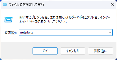 2)名前の欄に「netplwiz」と入力し、「OK」をクリック