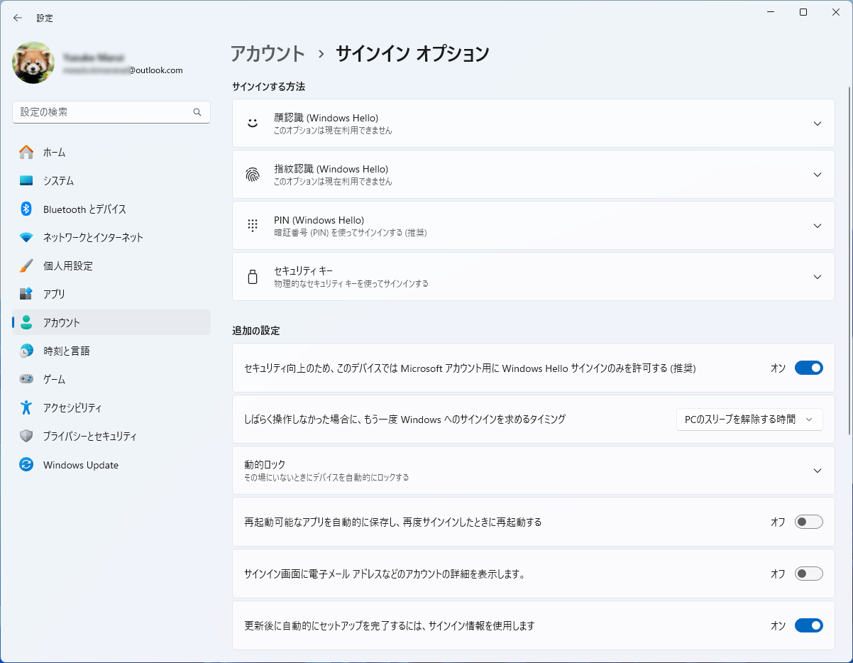 8)「サインイン オプション」内の「追加の設定」より「セキュリティ向上のため、このデバイスではMicrosoft アカウント用に〜〜〜」をオフにする