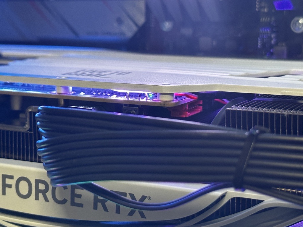 冷却ファンは110mmが2基、100mmが1基の構成。LEDライティングはAMP Extreme AIROほど細分化はされないものの、SPECTRA 2.0によるカスタマイズが可能です。バックプレートはダイキャストではないものの、金属製で高い剛性を保ちます。