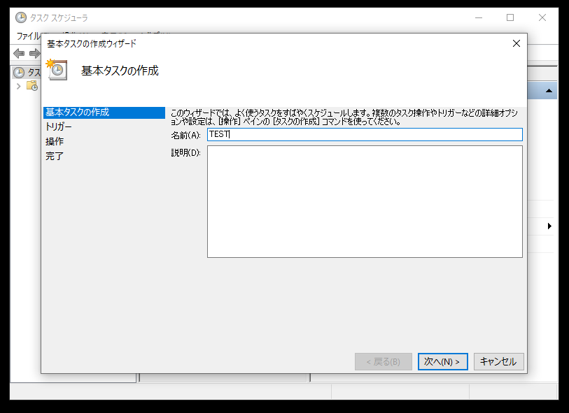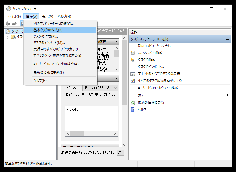 “タスク スケジューラ”内のメニュー”操作” -> “基本タスクの作成”をクリック