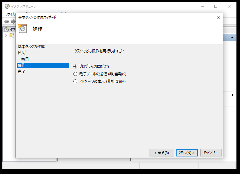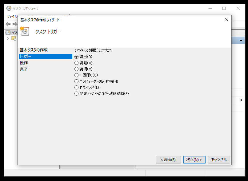いつタスクを開始するかを選択、業務用途であれば”毎日”で対応できますが、毎日シャットダウンするわけではない場合は、”毎週”や”毎月”といった特待のタイミングを指定。