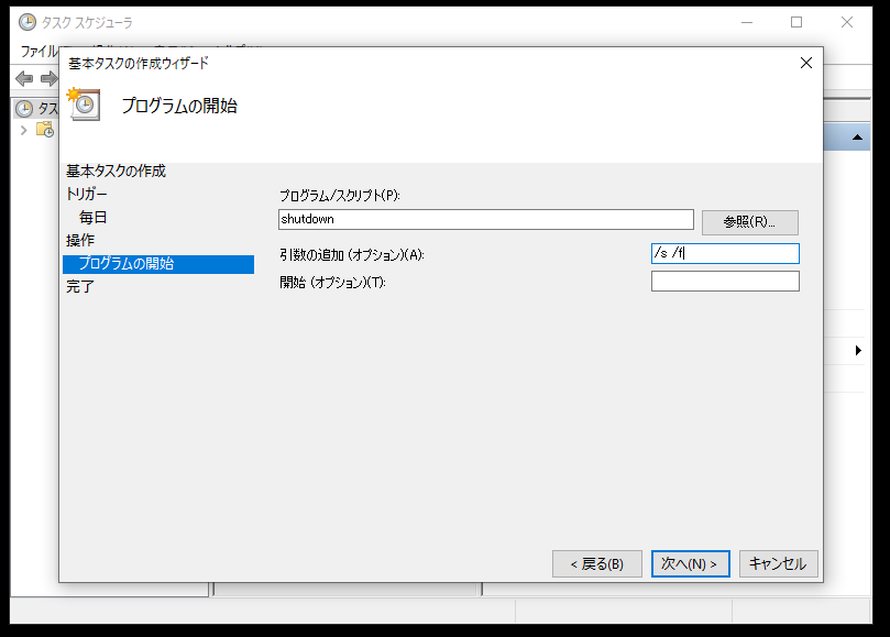 ”プログラム/スクリプト”の欄に”shutdown”と入力、”引数の追加”の欄に”/s /f”を追加し、”次へ”をクリック