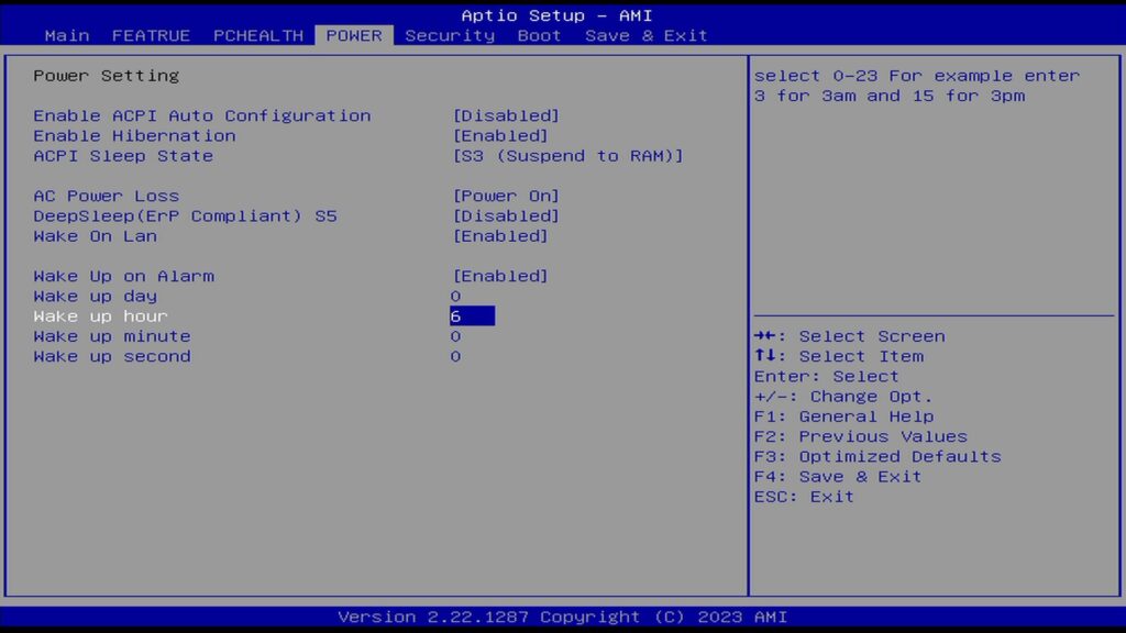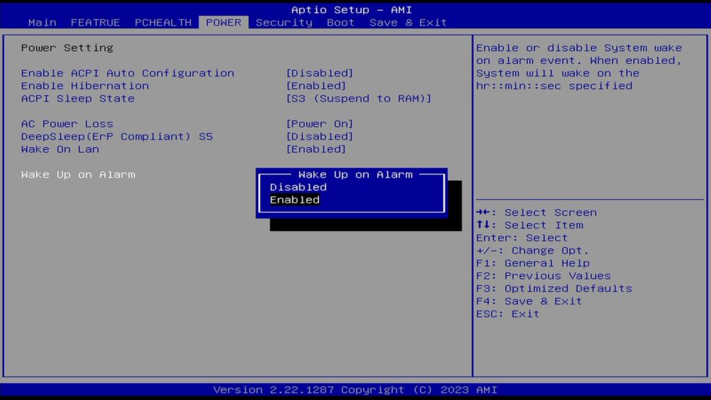 BIOS上での設定項目は“POWER” -> “Wake Up on Alarm”。この項目を”Enabled”に設定することでタイマーを利用した起動を行えるようになります。
